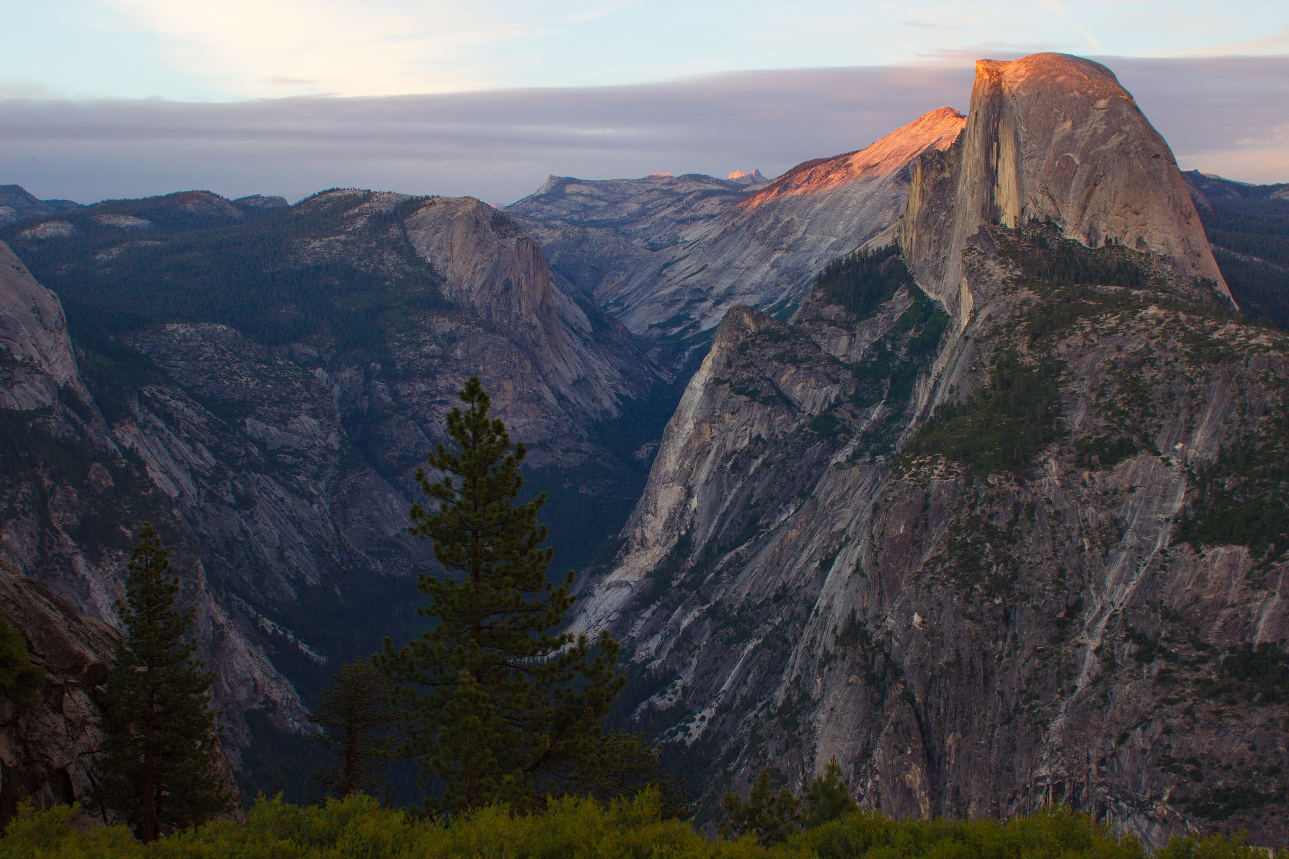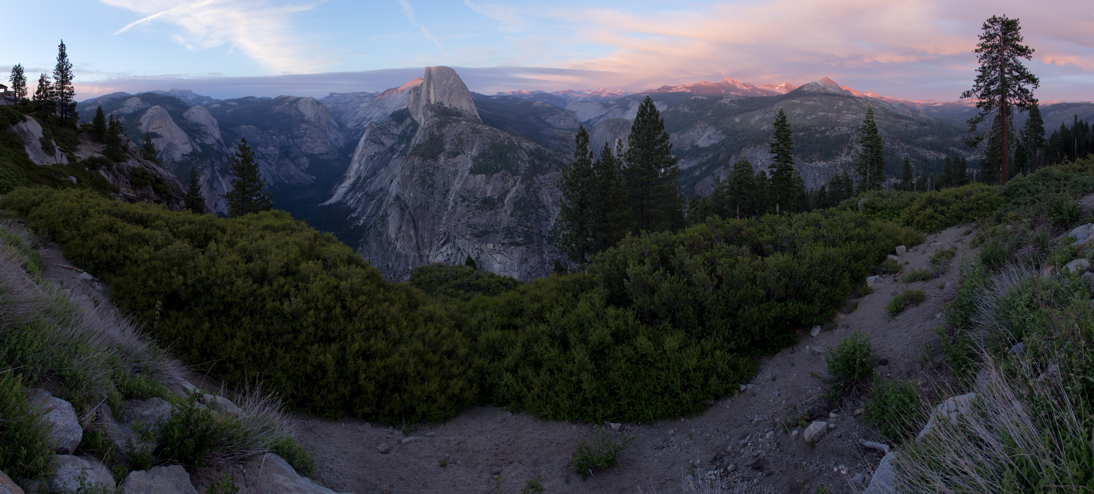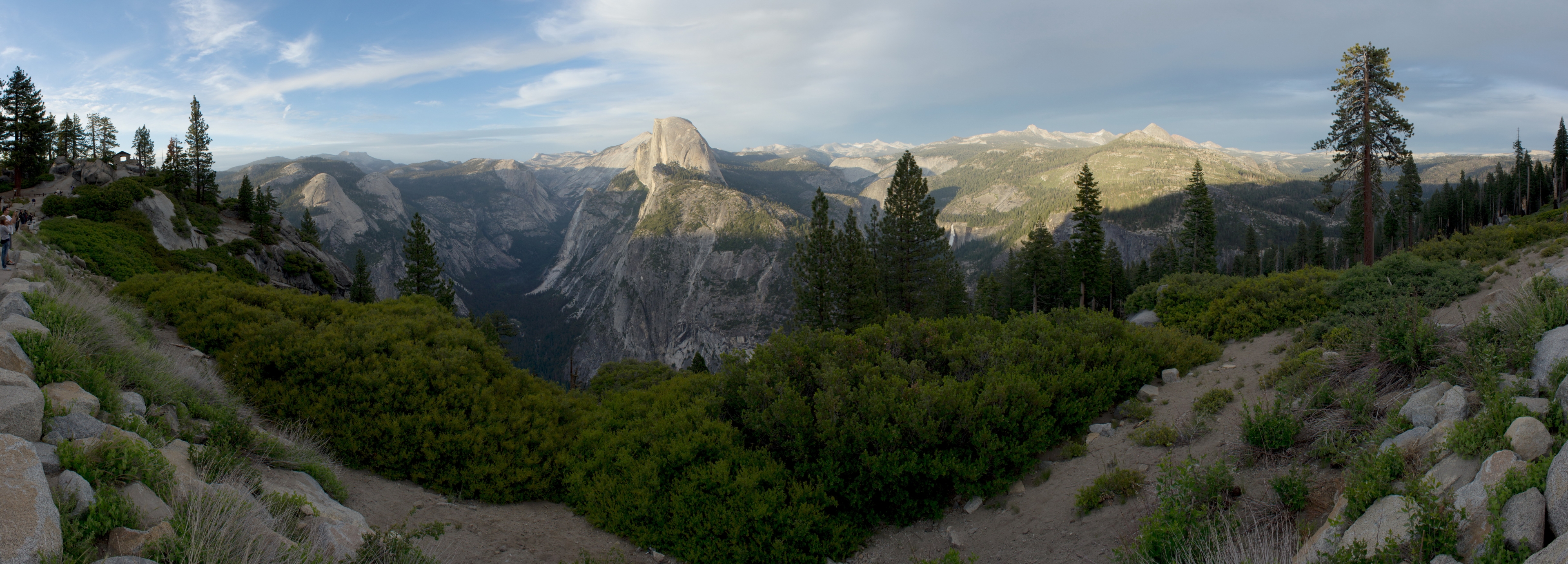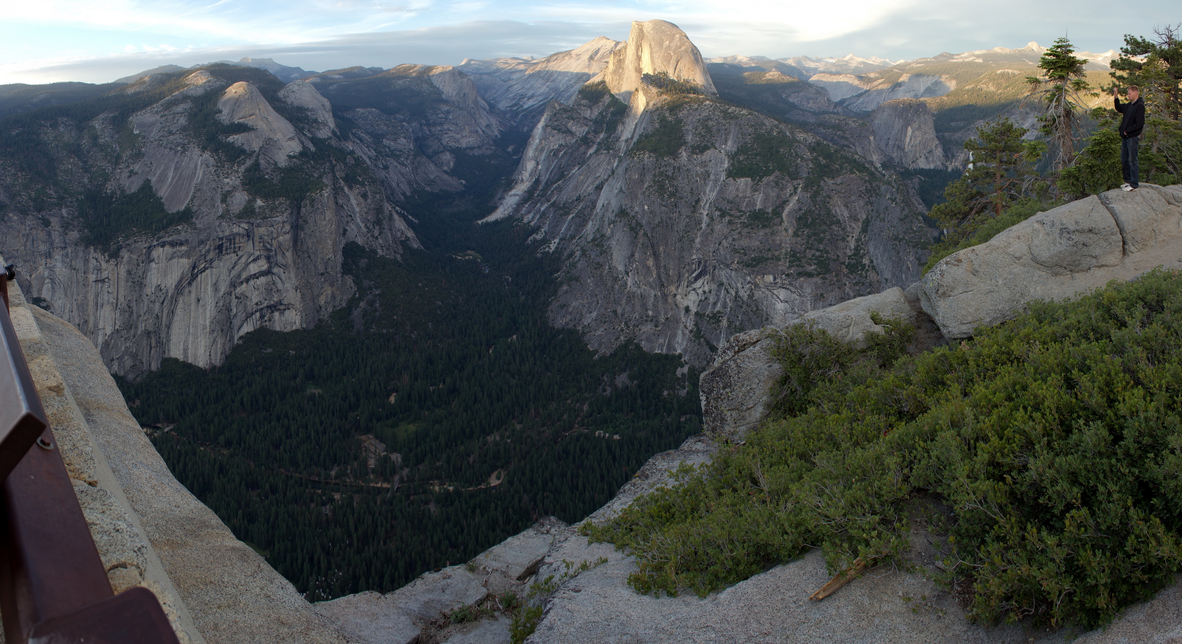 Einmal angekommen, wird man mit einer atemberaubenden Landschaft belohnt. Am Nachmittag habe ich den Loop Trail im Yosemite Valley abgelaufen, auf dem man unter anderem an den Yosemite Falls vorbeikommt. Vom Tal aus kann man über den Four Mile Trail zum Glacier Point hochwandern, an dem die meisten der nachfolgenden Bilder entstanden sind. Da ich nur einen halben Tag Zeit hatte, bin ich ich mit dem Auto hochgefahren und konnte so rechtzeitig zum Sonnenuntergang oben sein.