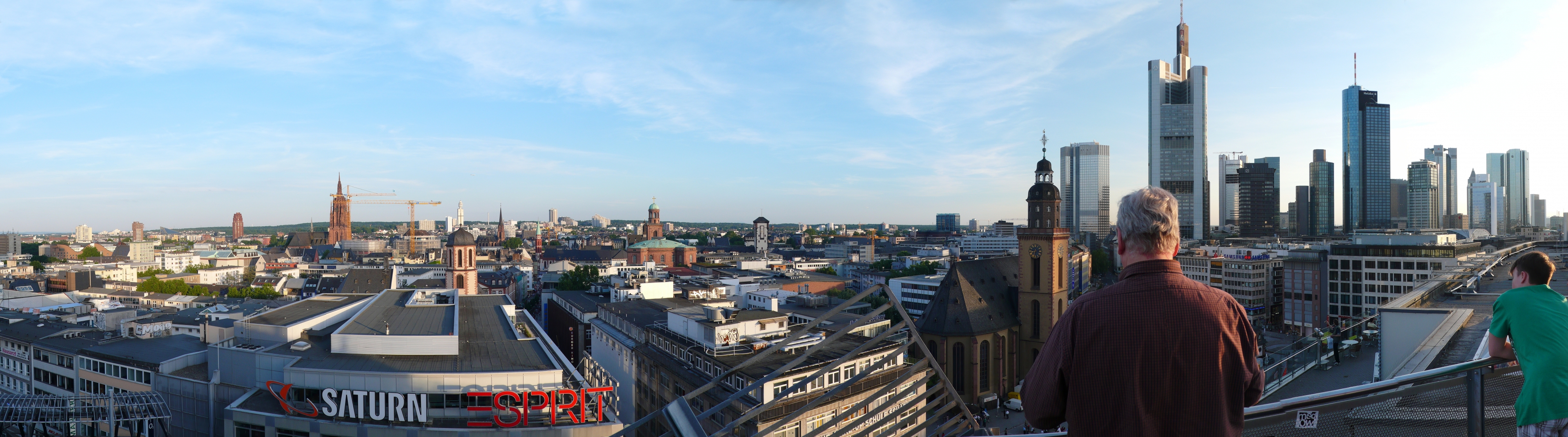 Hier einige Aufnahmen aus Frankfurt, entstanden mit meiner Panasonic Lumix DMC-LX2 im Dezember 2013. Die Kamera ist im Vergleich zur Canon-DSLR deutlich besser zum Erstellen von Panoramas geeignet. Zwar fehlt ein automatischer Panoramamodus wie bei modernen Kameras, aber man kann mit einem Knopfdruck auf „AF-AE LOCK“ alle relevanten Parameter, d.h. Blende, Belichtungszeit, Fokus und Weißabgleich, fixieren. Außerdem ist das kompakte Format und der elektronische Sucher wesentlich besser dazu geeignet, sauber versetzte Aufnahmen zu erstellen, damit sie der Stitcher problemlos zusammenfügen kann.